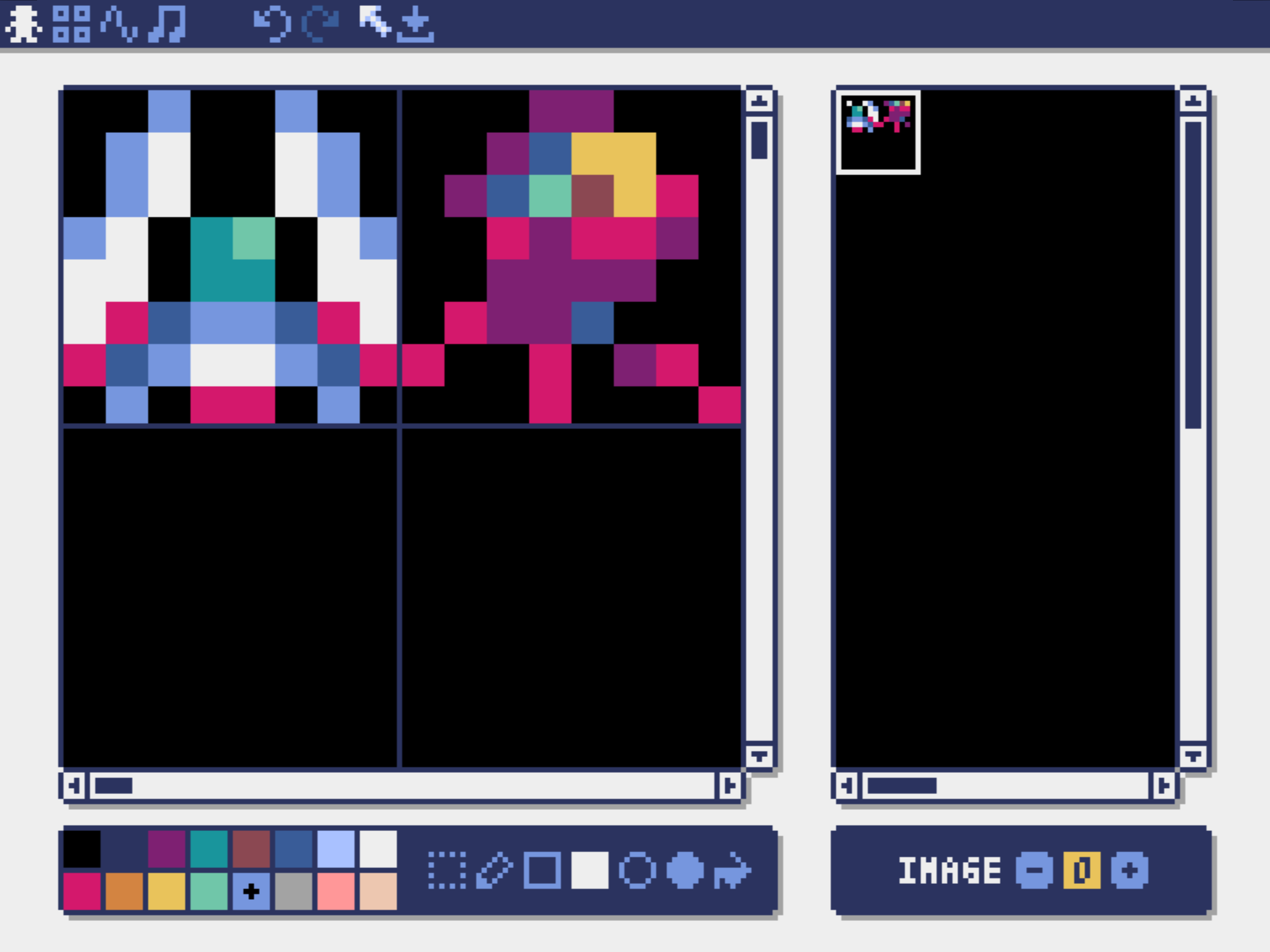 Remarque que les sprites sont créés sur une seule image, numérotée 0 (visible en bas à droite de l'éditeur). Pyxel propose également une palette limitée à 8 couleurs: