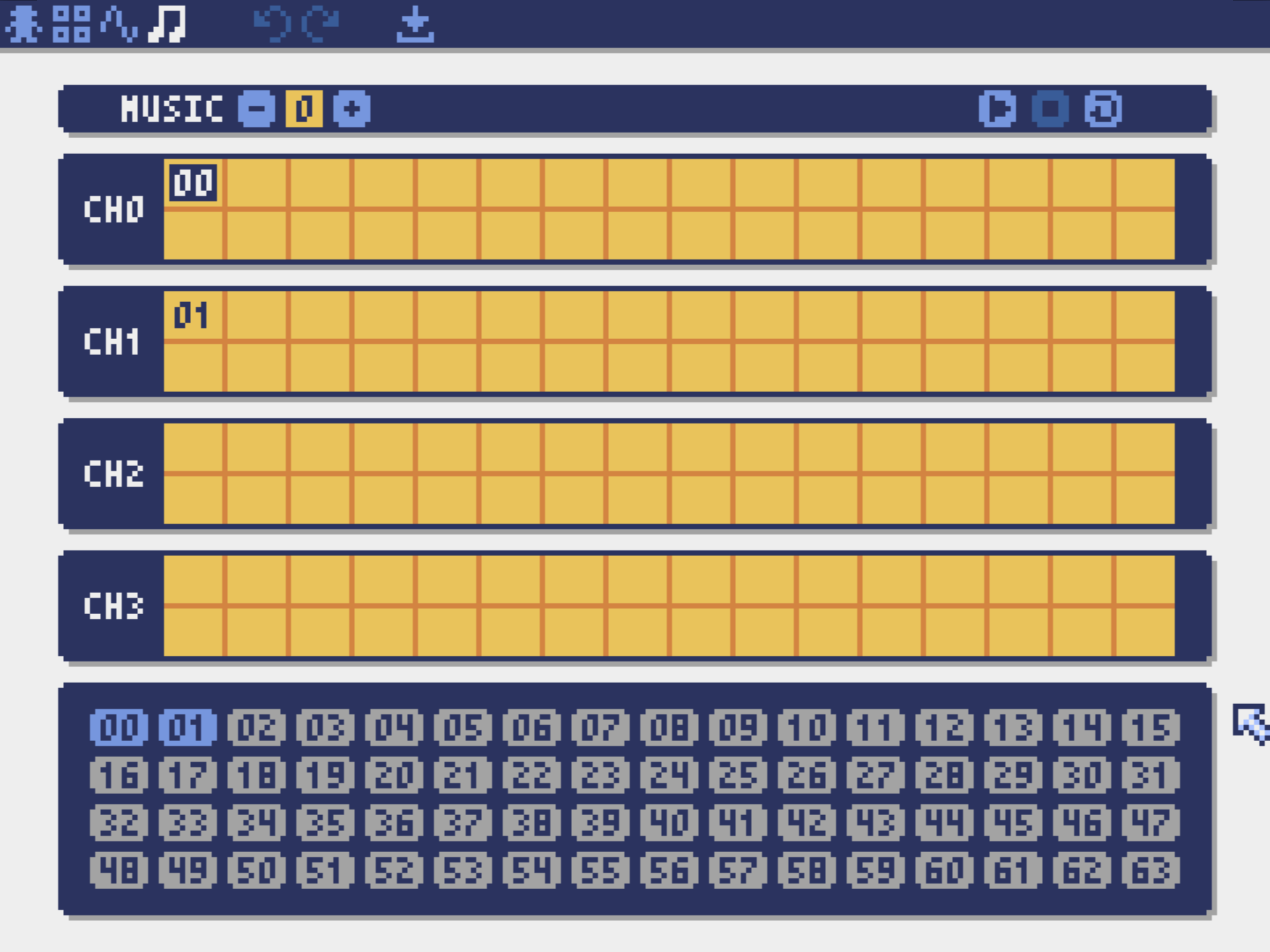 pyxel edit shooterLa barre du haut te permet de naviguer entre les différents éditeurs. N'oublie pas de sauvegarder tes modifications avec le bouton le plus à droite avant de quitter.