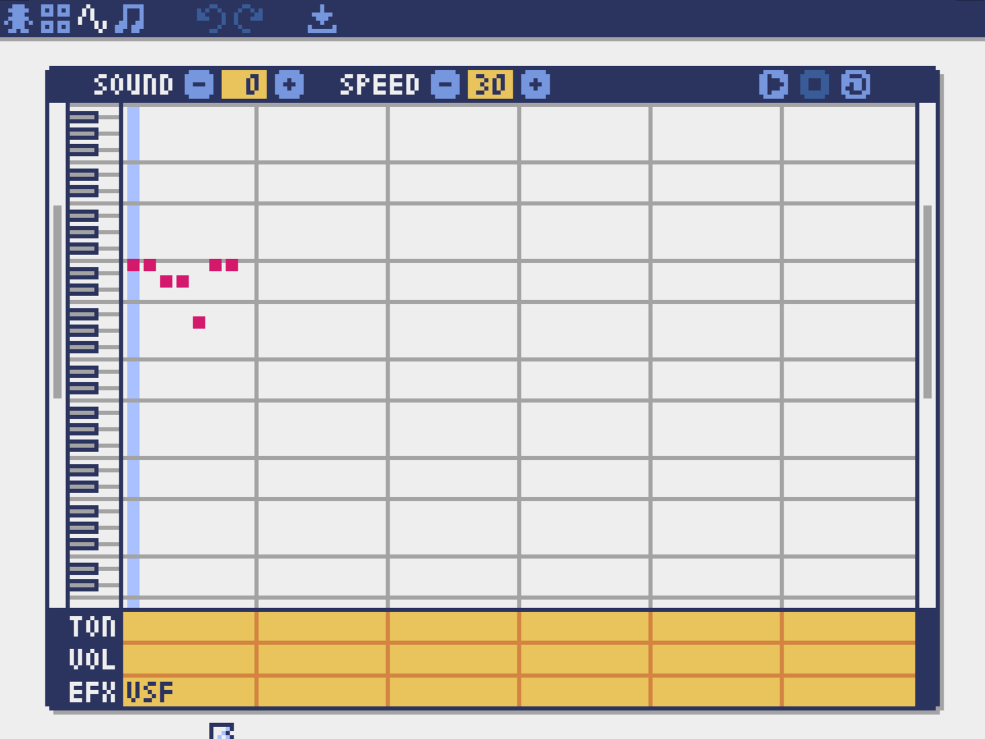 Si tu le souhaite, tu peux créer des sons pour le jeu. Pour cela, rends-toi sur l'avant-dernier outil de l'éditeur (dans la barre du haut) pour créer différents sons.